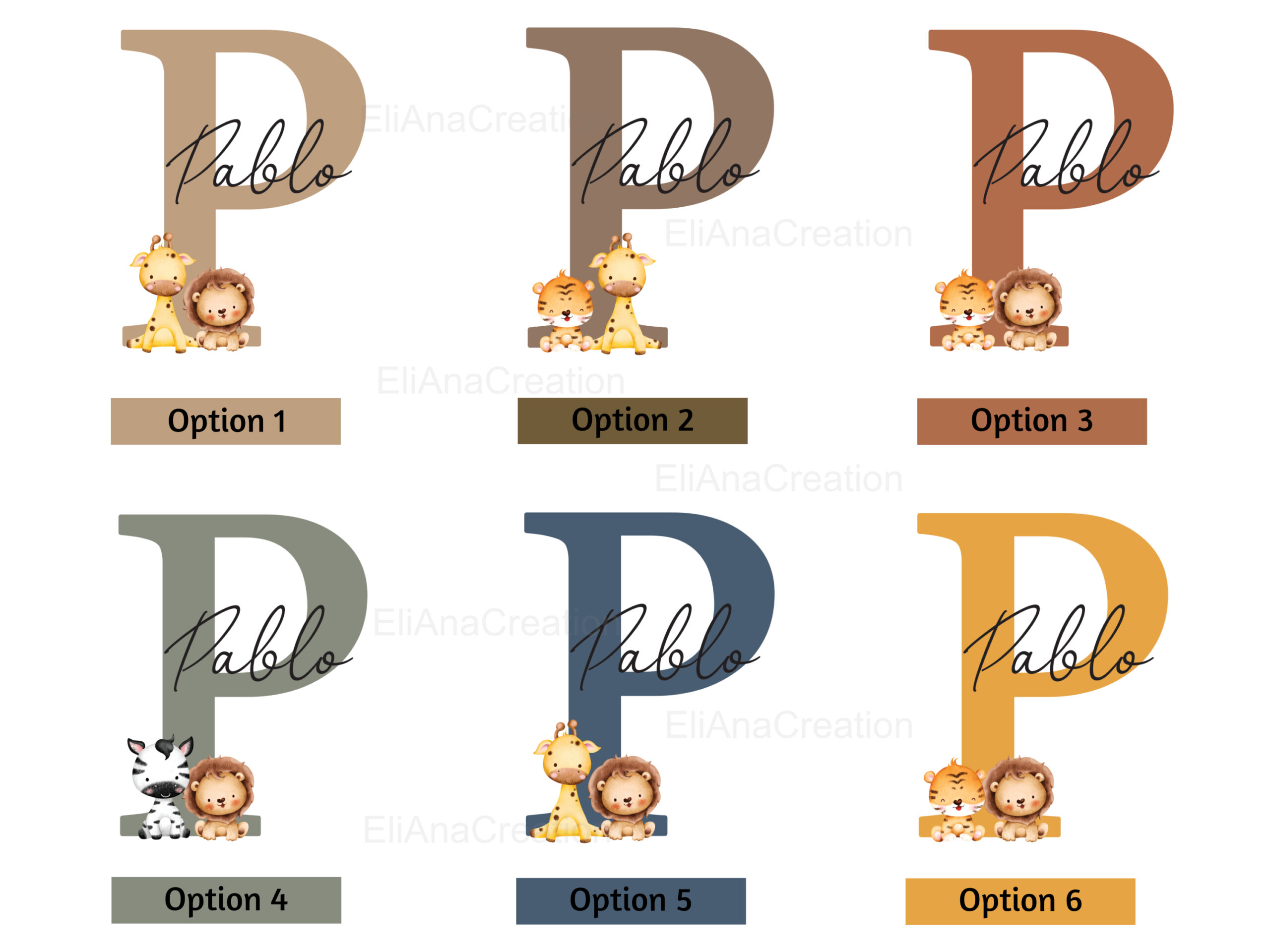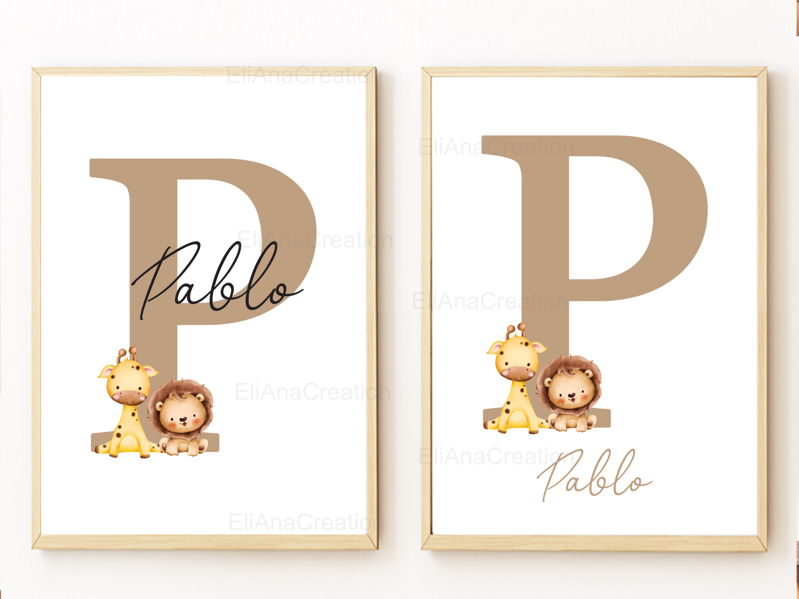 L’affiche Prénom est complètement personnalisable : vous choisissez le style désiré (prénom sur l’initiale ou en dessous), la couleur et les 2 animaux sur l’initiale parmi les différentes options proposées.