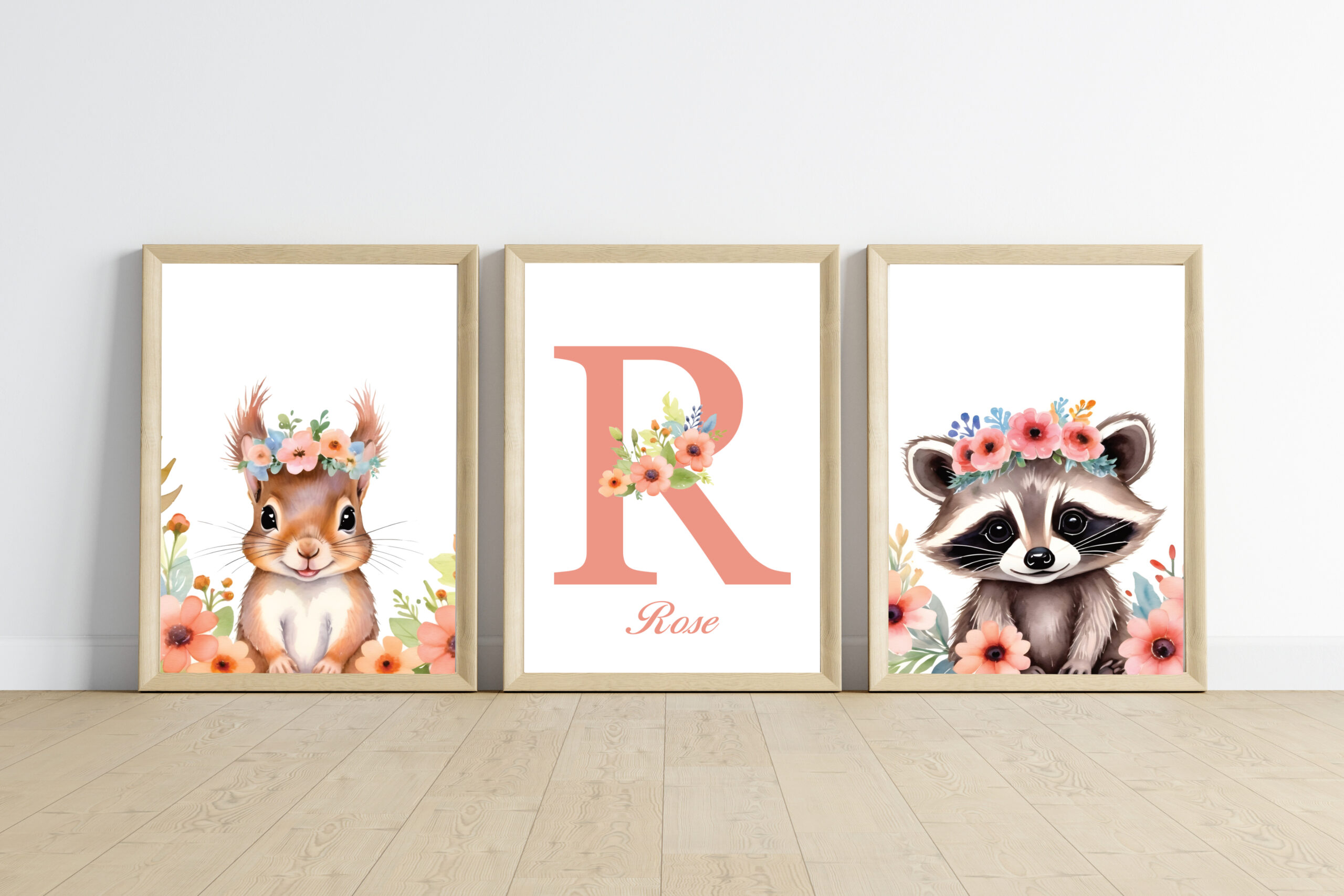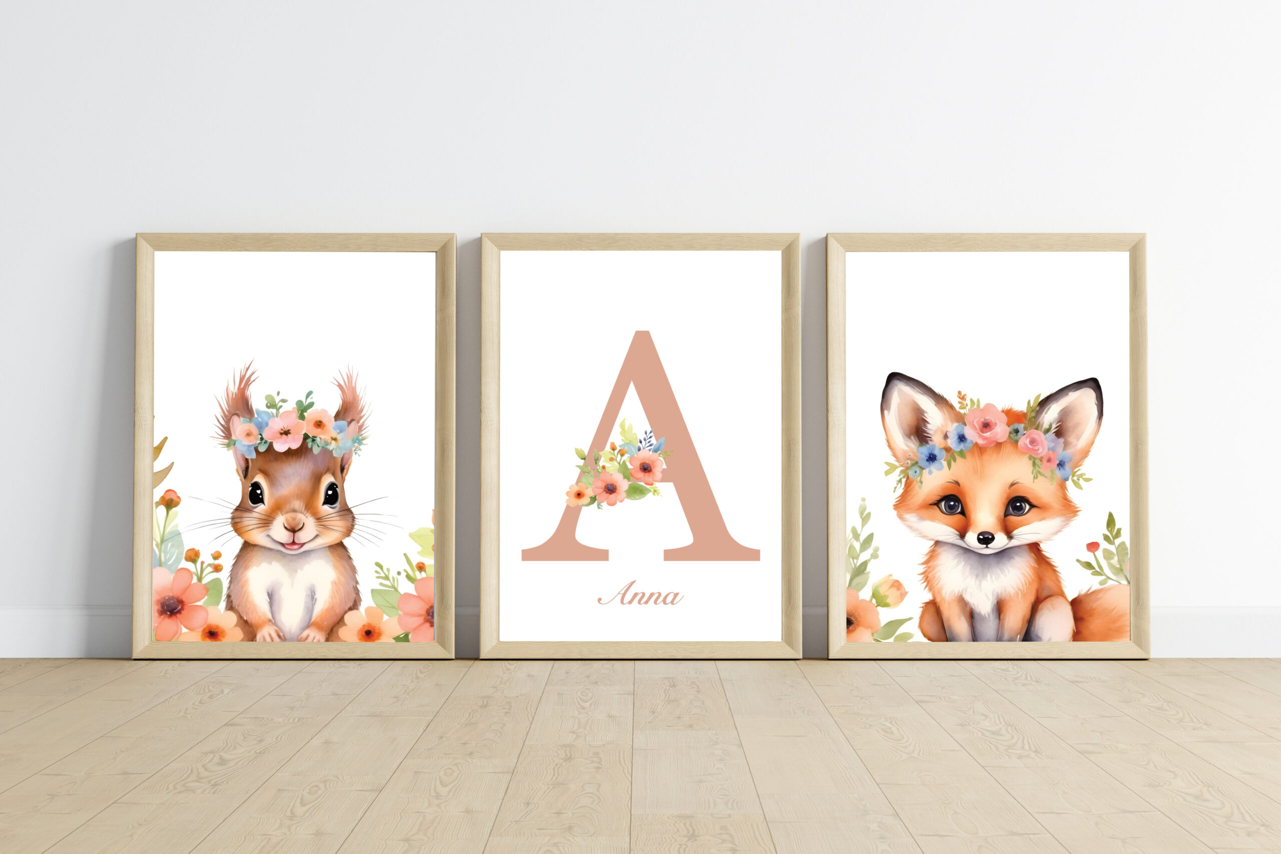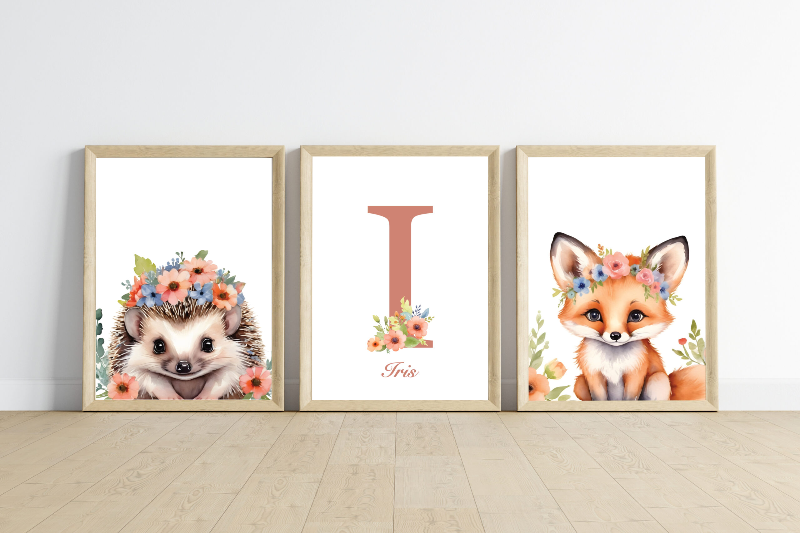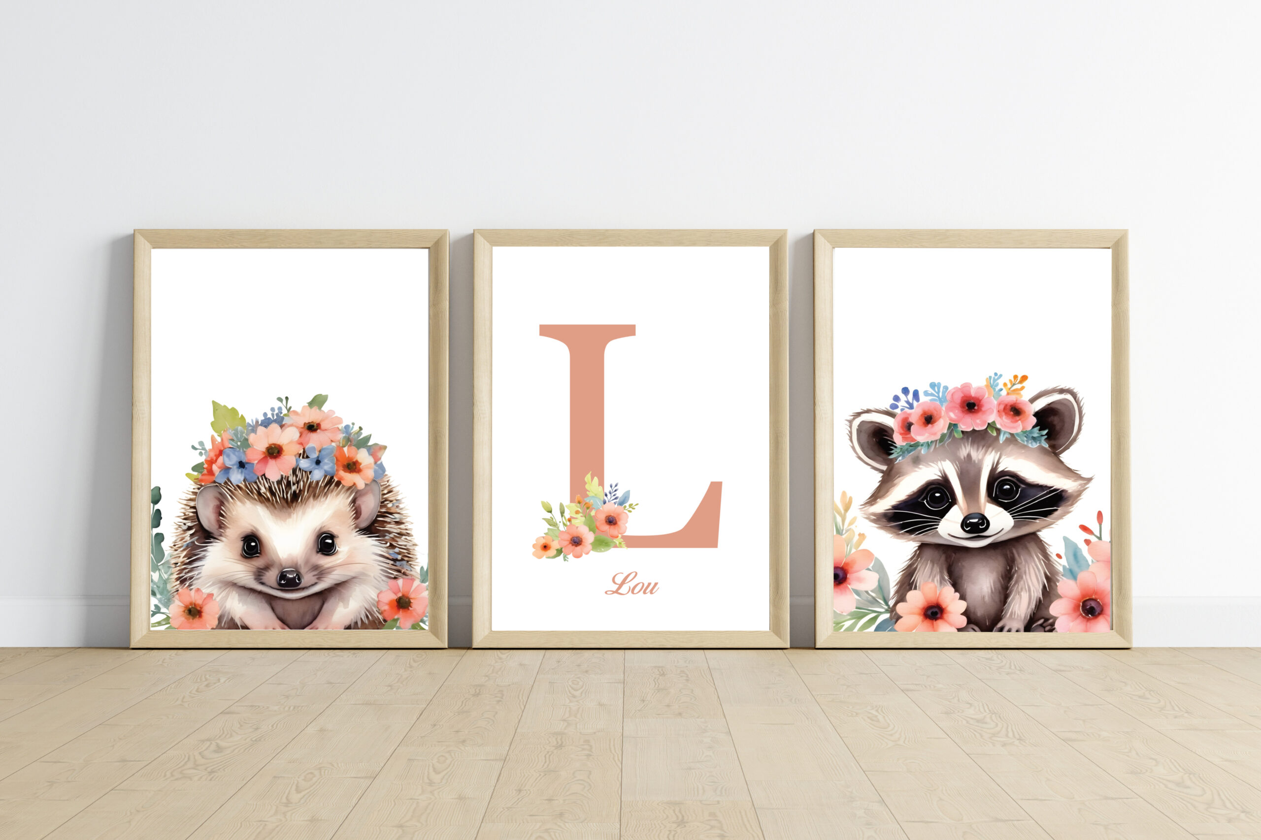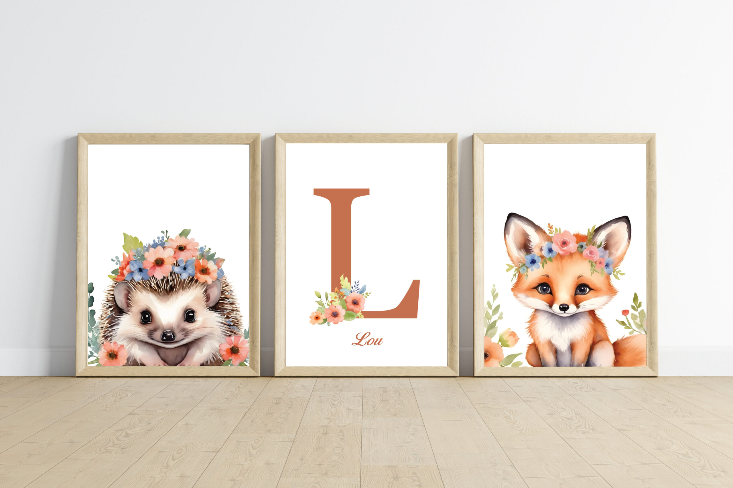 - 1 affiche animal + 1 affiche prénom : qui correspond à 2 affiches (1 affiche animal et 1 affiche prénom avec initiale + prénom + des fleurs sur l’initiale).