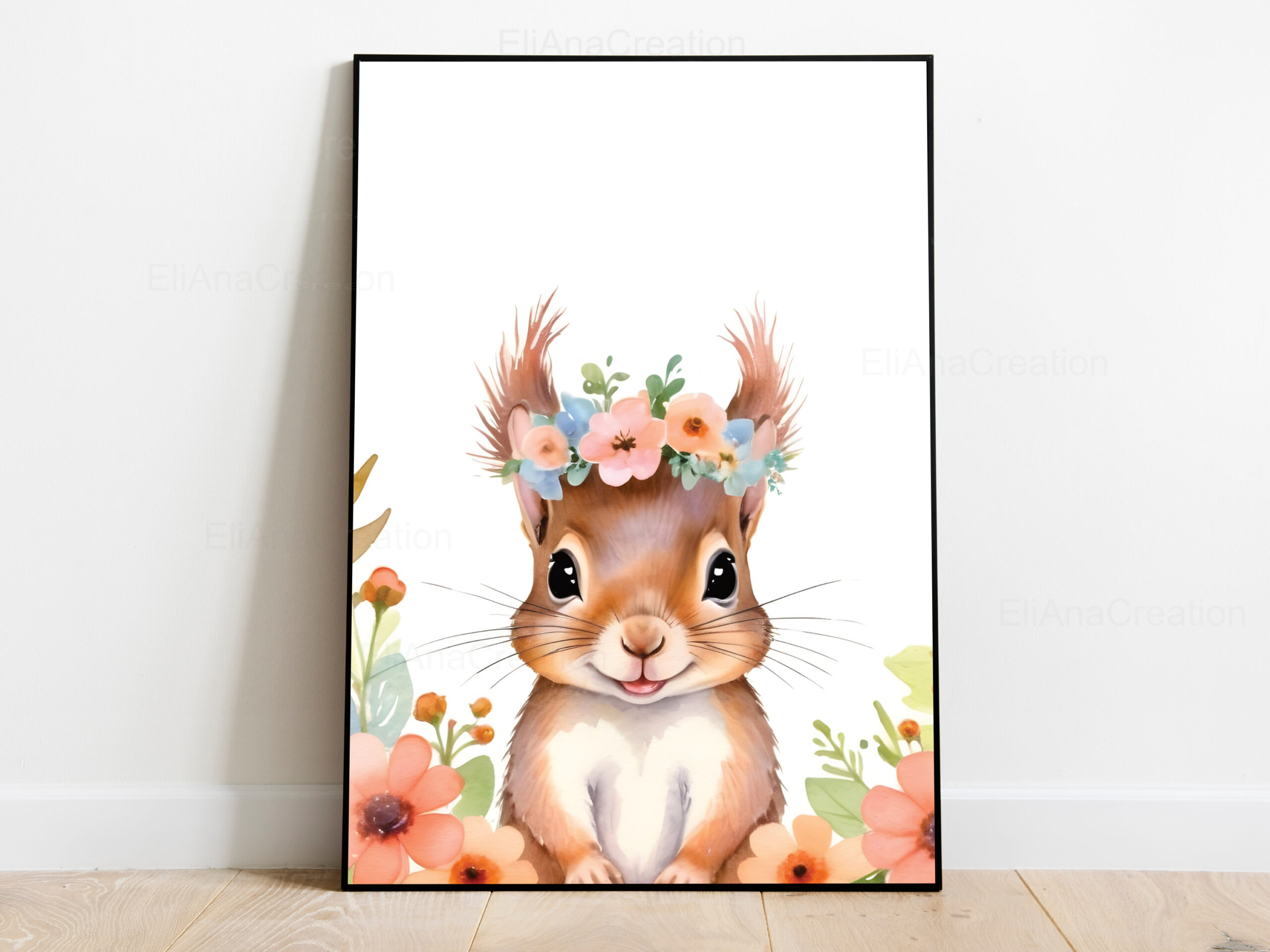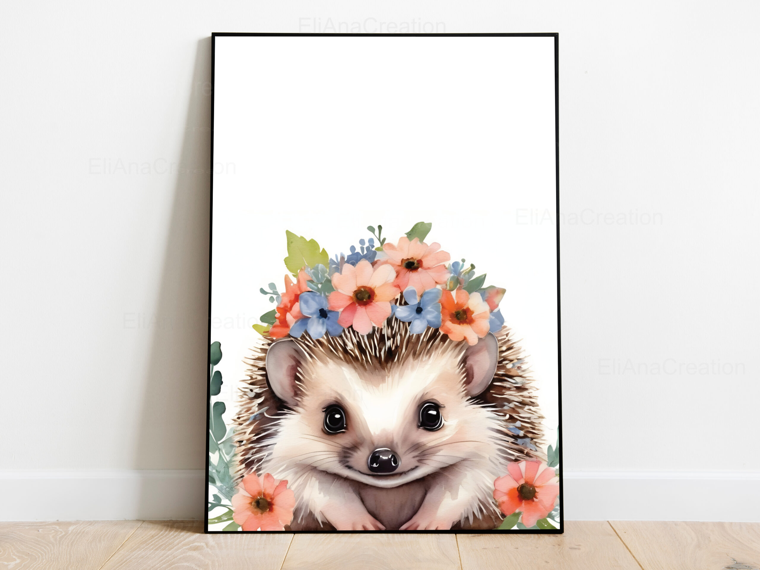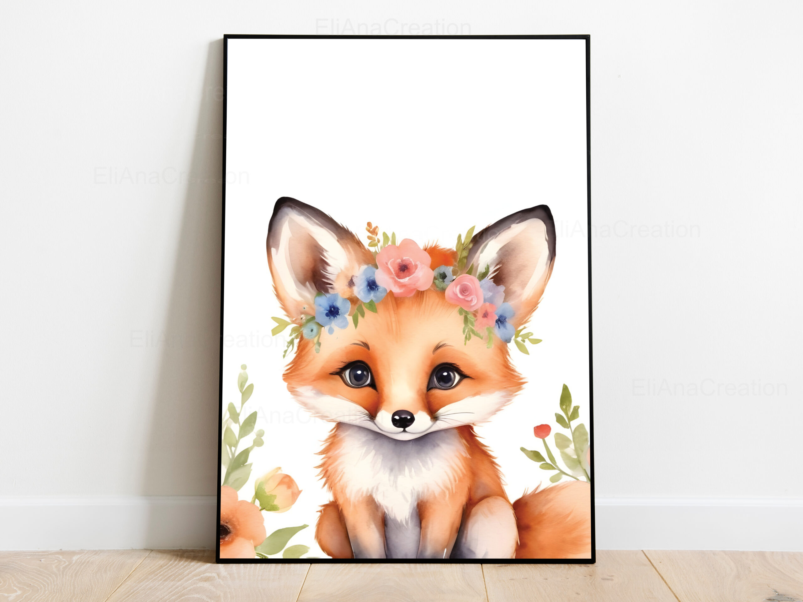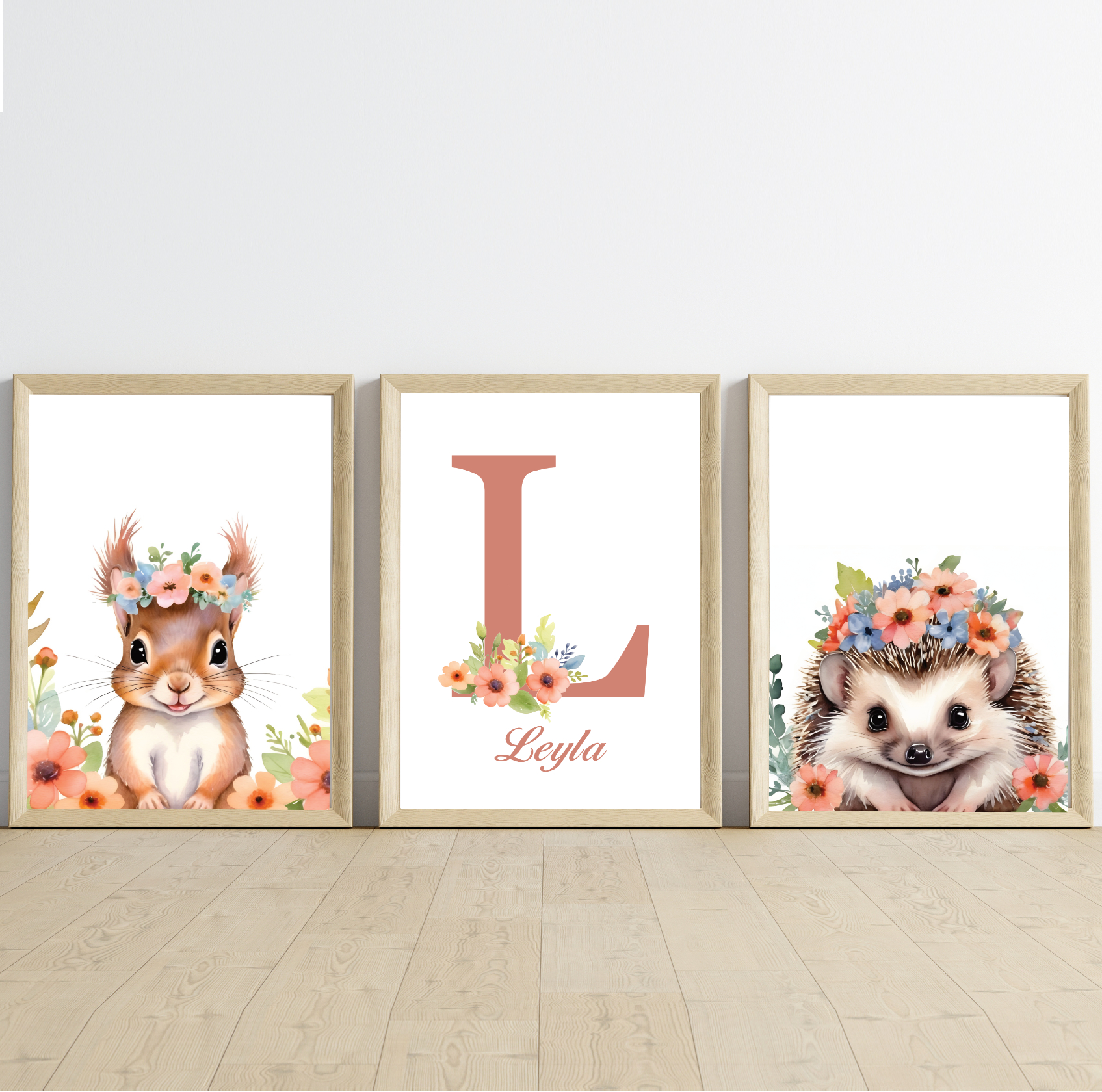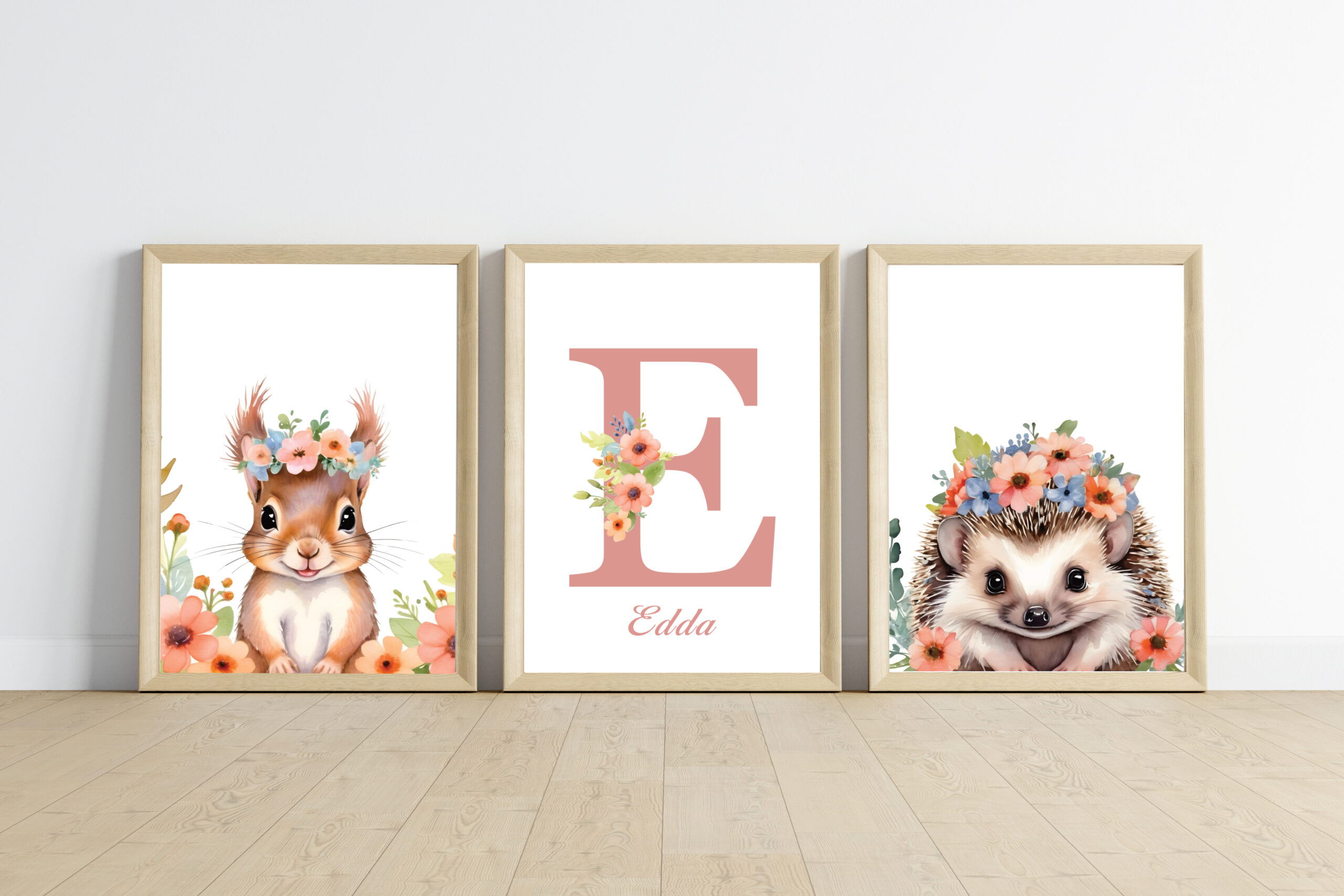 - 1 affiche animal + 1 affiche prénom : qui correspond à 2 affiches (1 affiche animal et 1 affiche prénom avec initiale + prénom + des fleurs sur l’initiale).