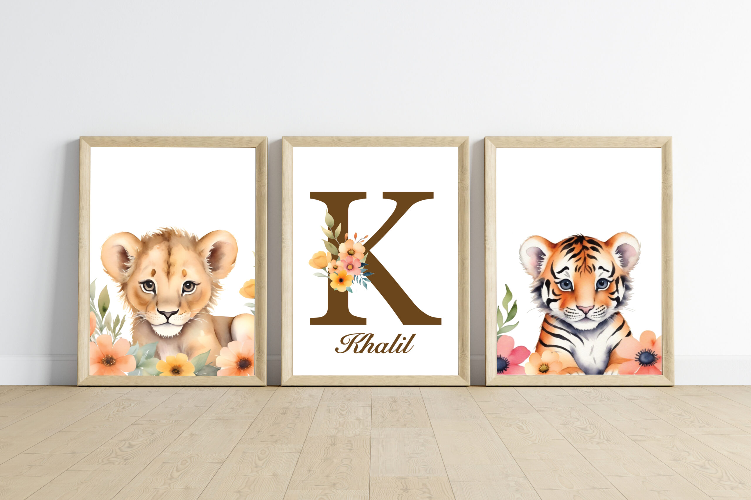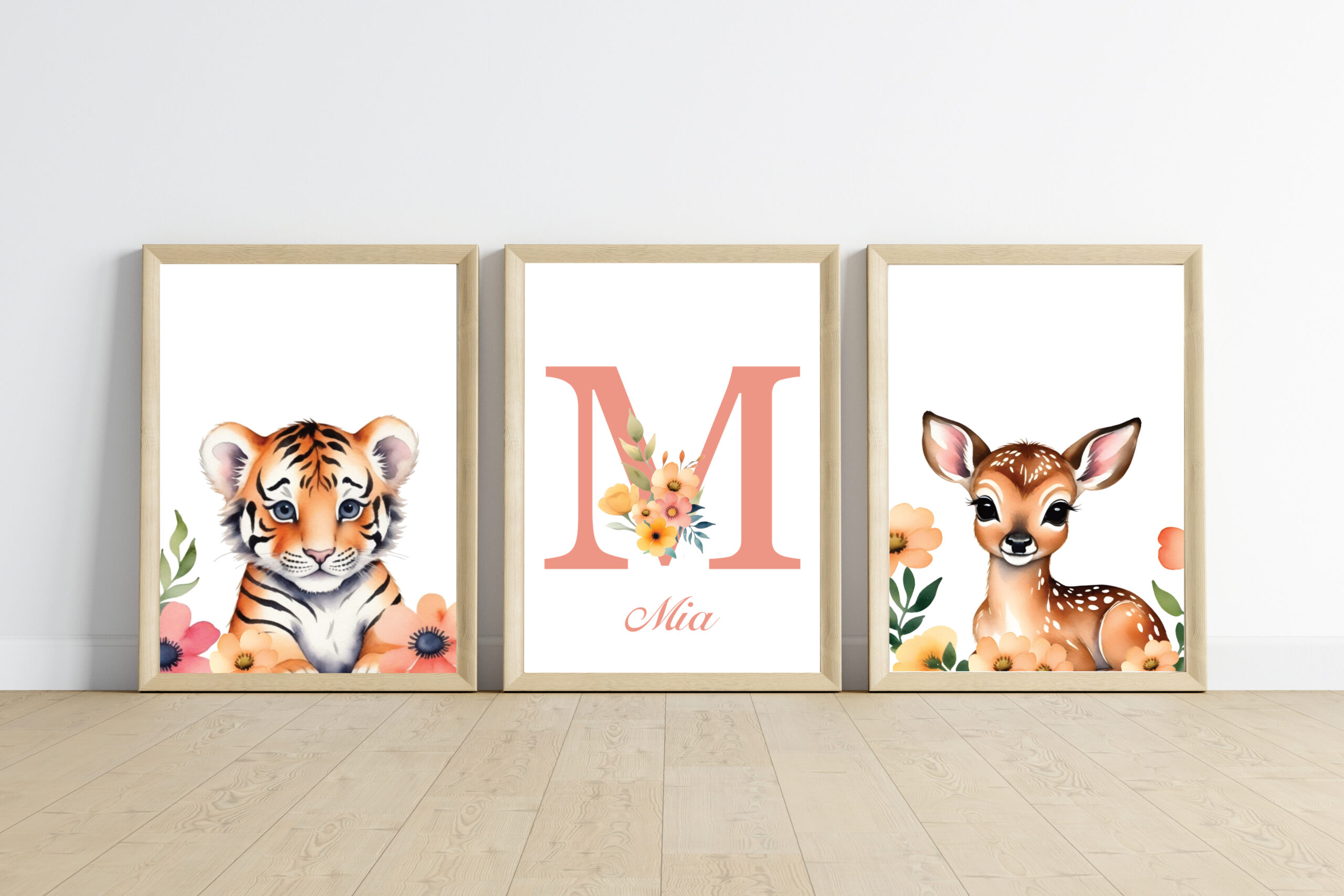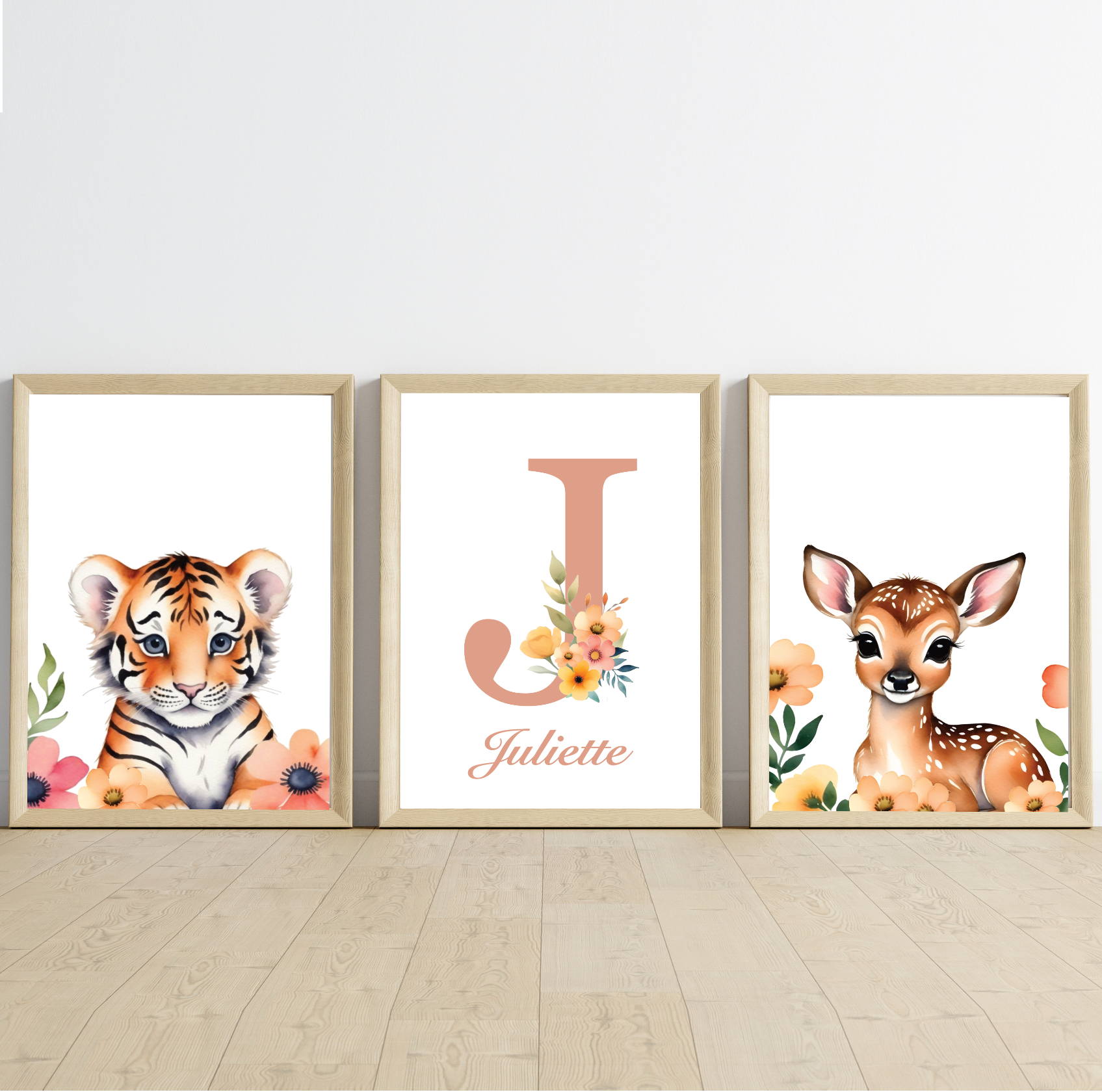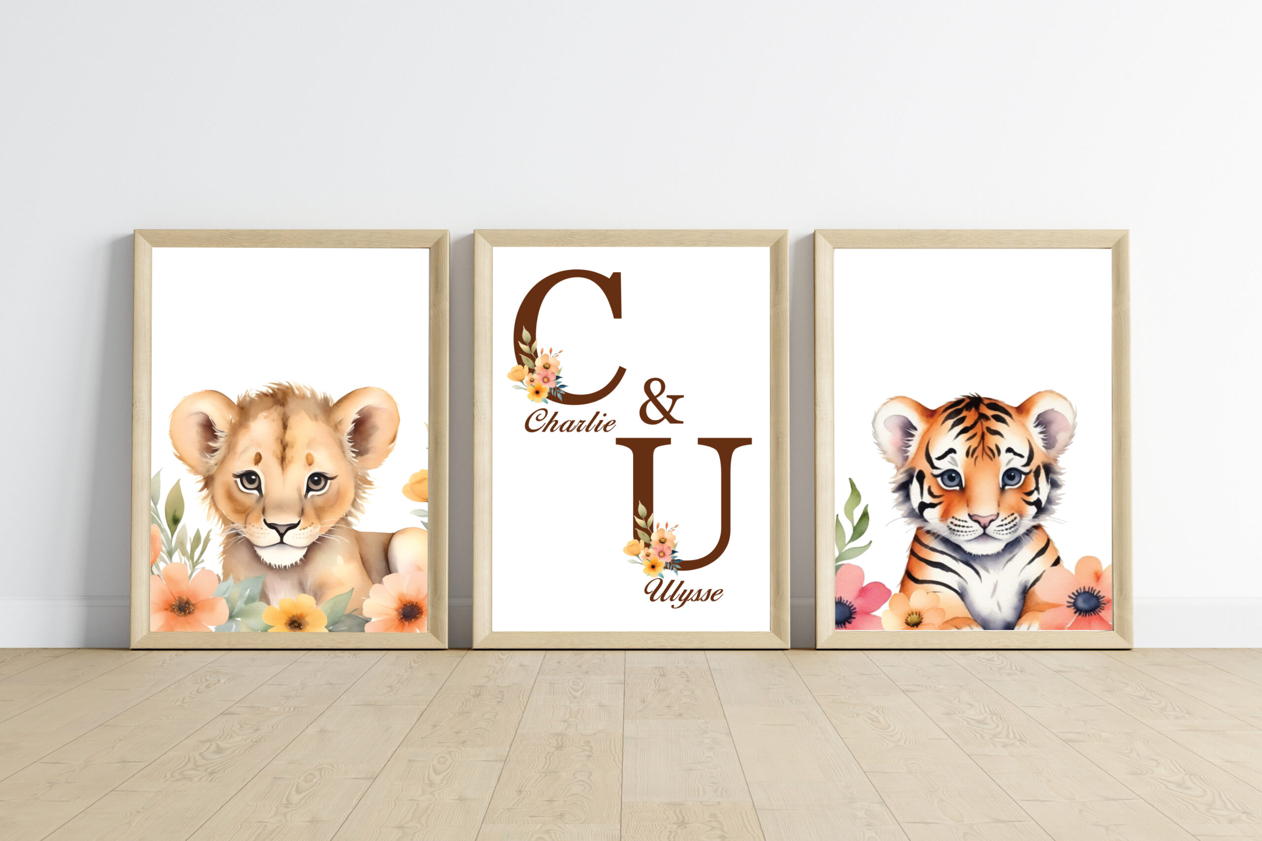 - 1 affiche animal + 1 affiche prénom : qui correspond à 2 affiches (1 affiche animal et 1 affiche prénom avec initiale + prénom + des fleurs sur l’initiale).