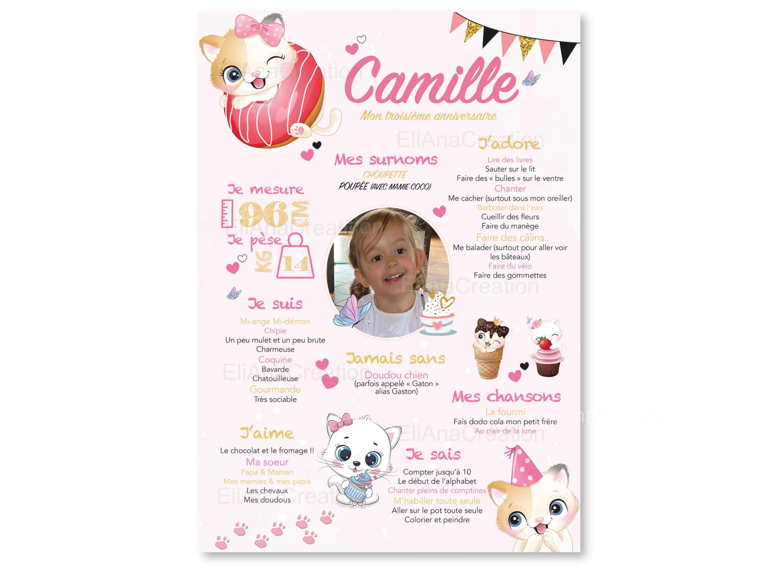 Personnalisez votre affiche anniversaire avec votre texte et remplissez-la de petites anecdotes en fonction de l’âge de votre enfant.