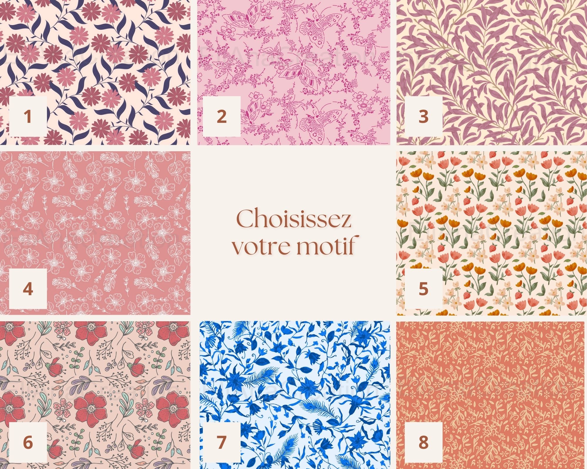 - Possibilité de personnaliser le mot sur l’affiche et choix du motif Liberty parmi 8 motifs.