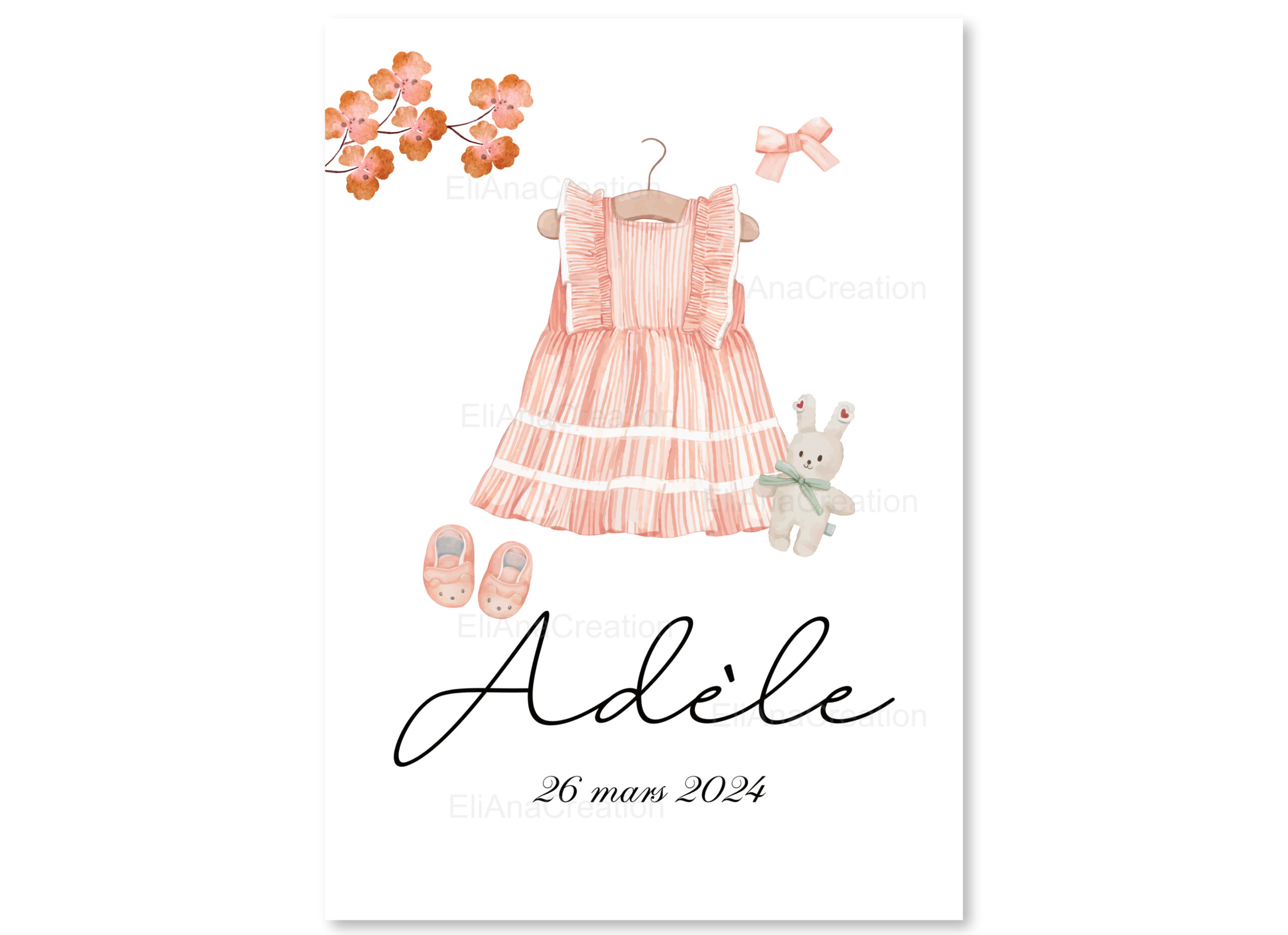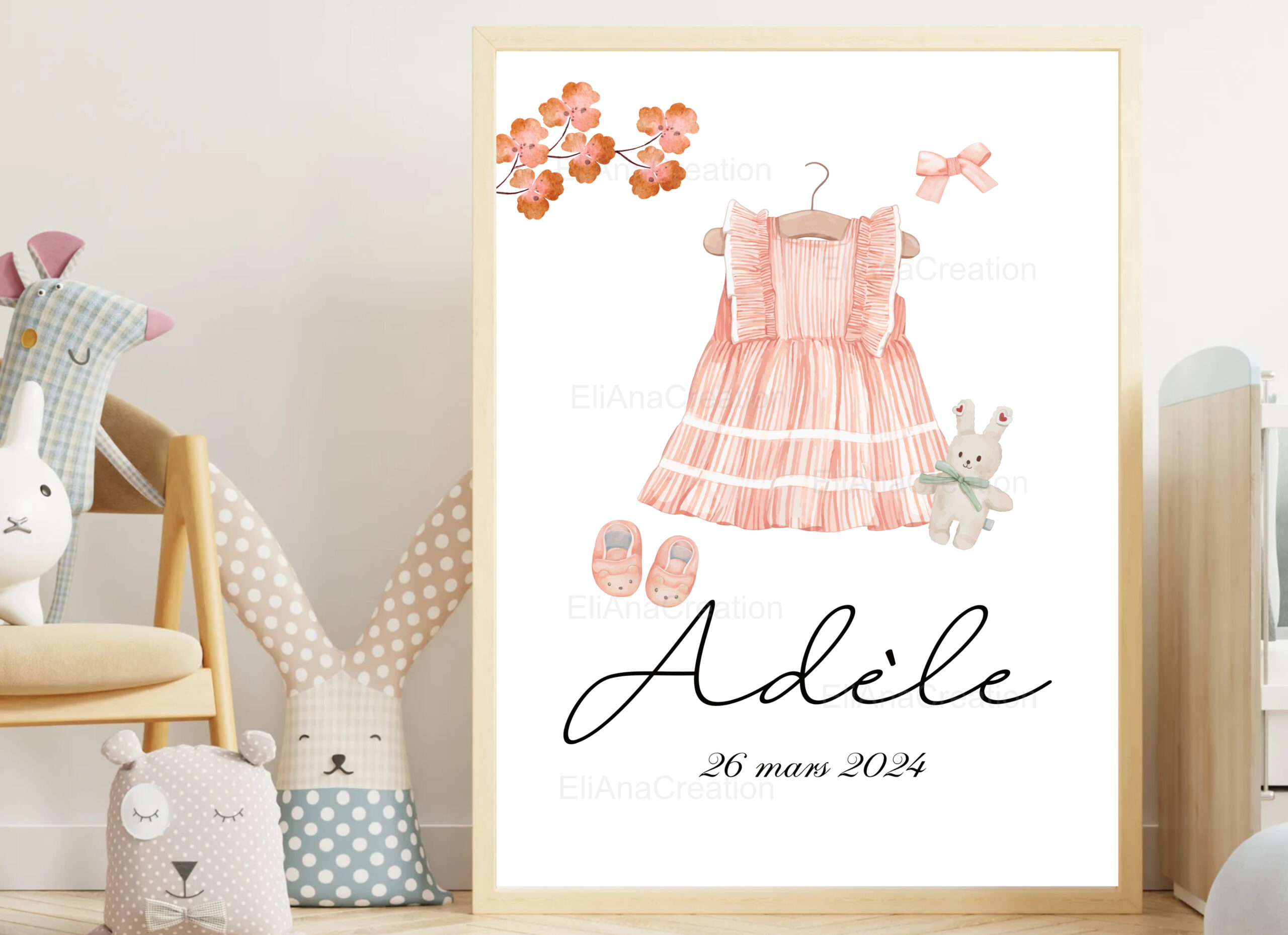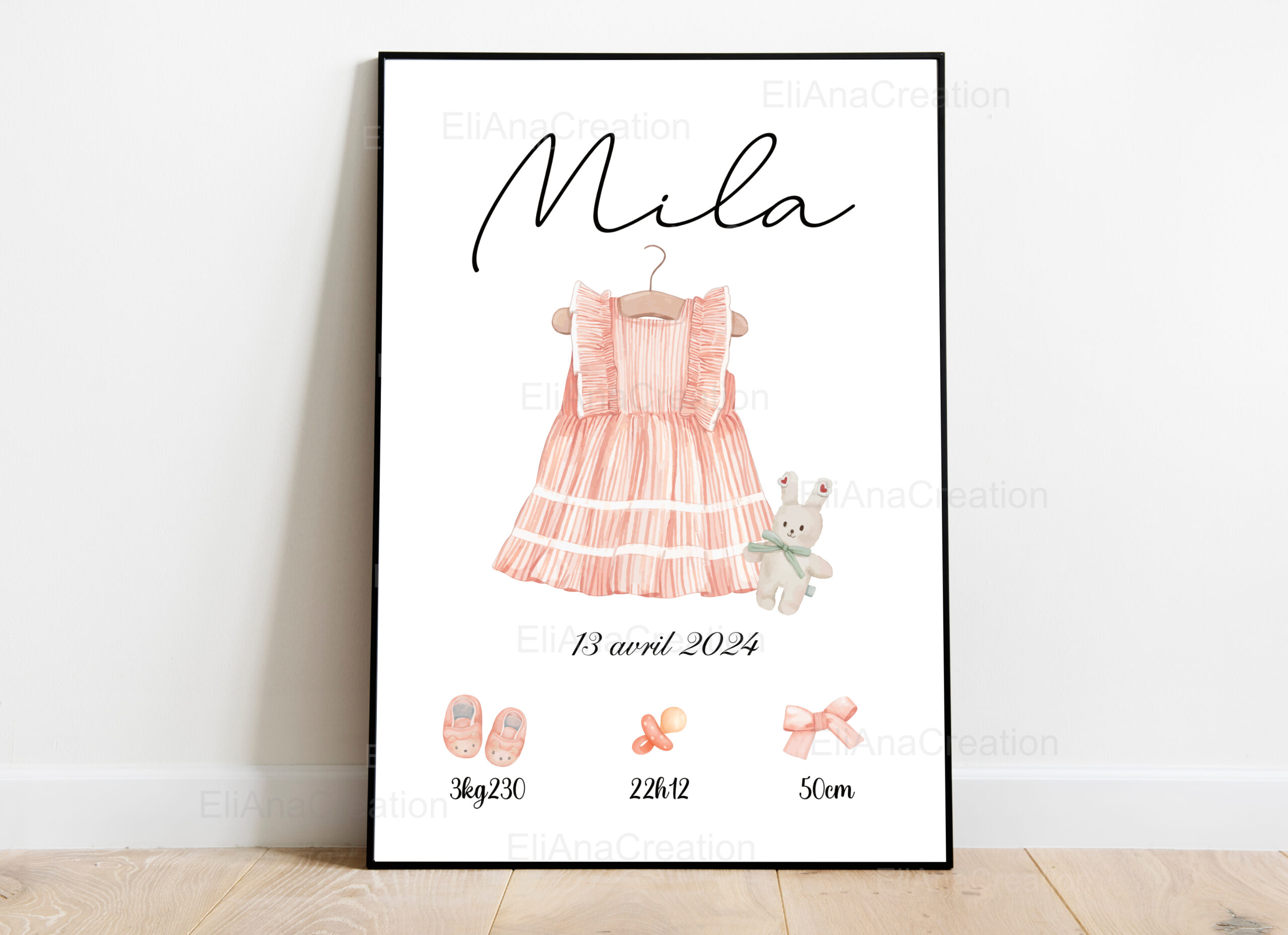Elle est idéale pour décorer une chambre d’enfant ou offrir un cadeau de naissance unique et personnalisé. Une affiche douce et intemporelle pour garder un joli souvenir des premiers instants.