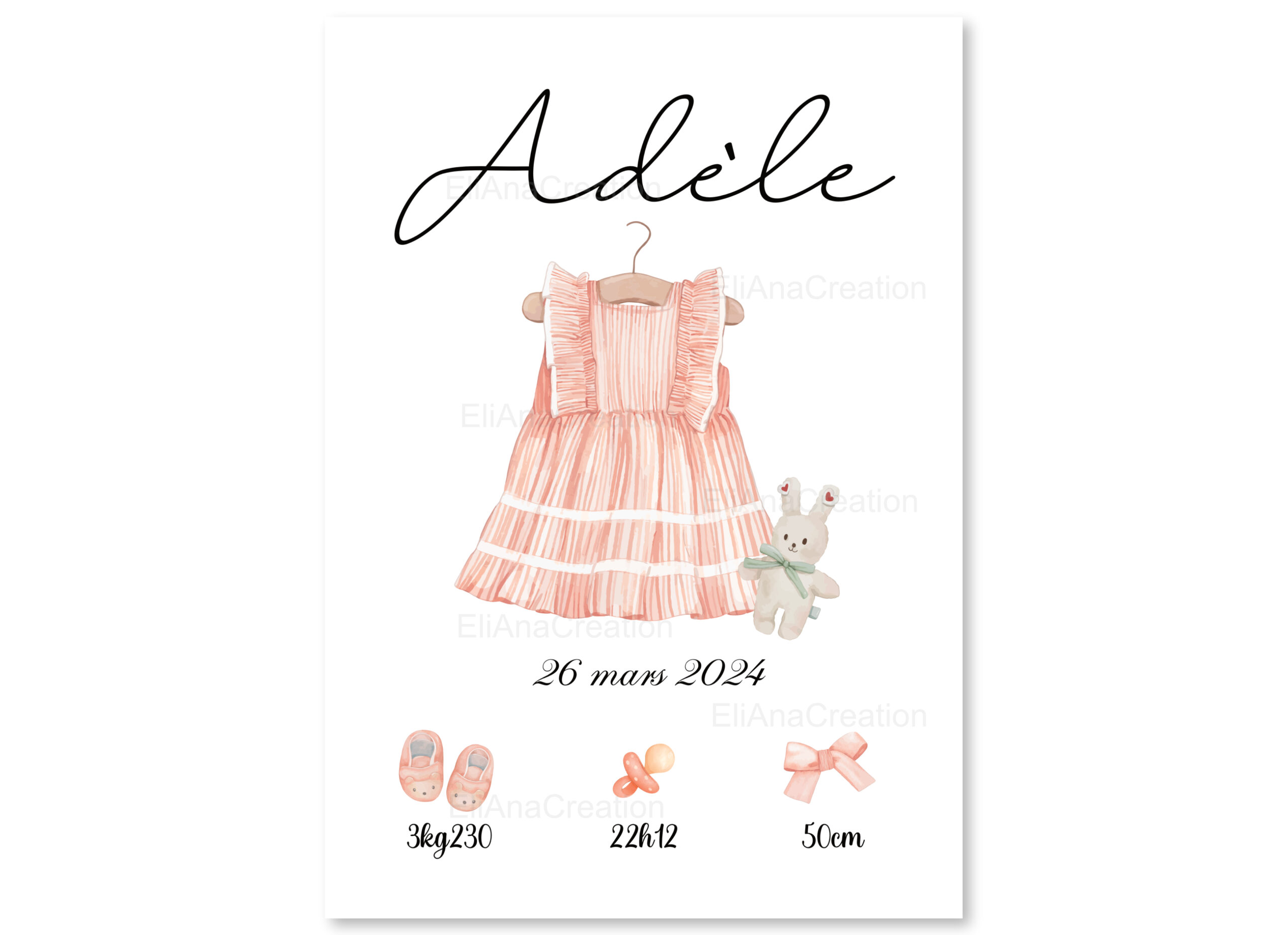 Affiche de naissance à personnaliser avec le prénom de l’enfant, sa date de naissance, son heure, son poids et sa taille.