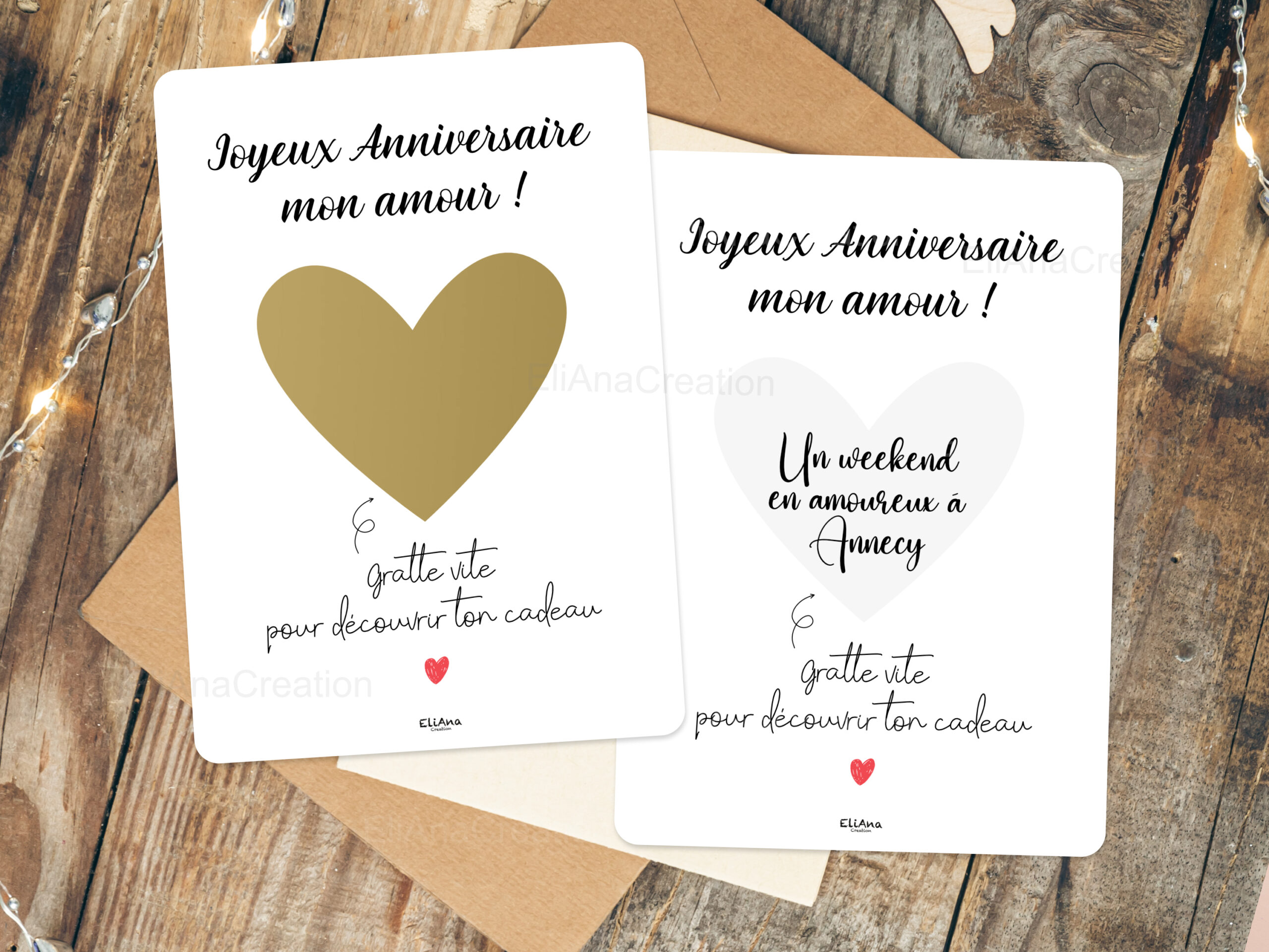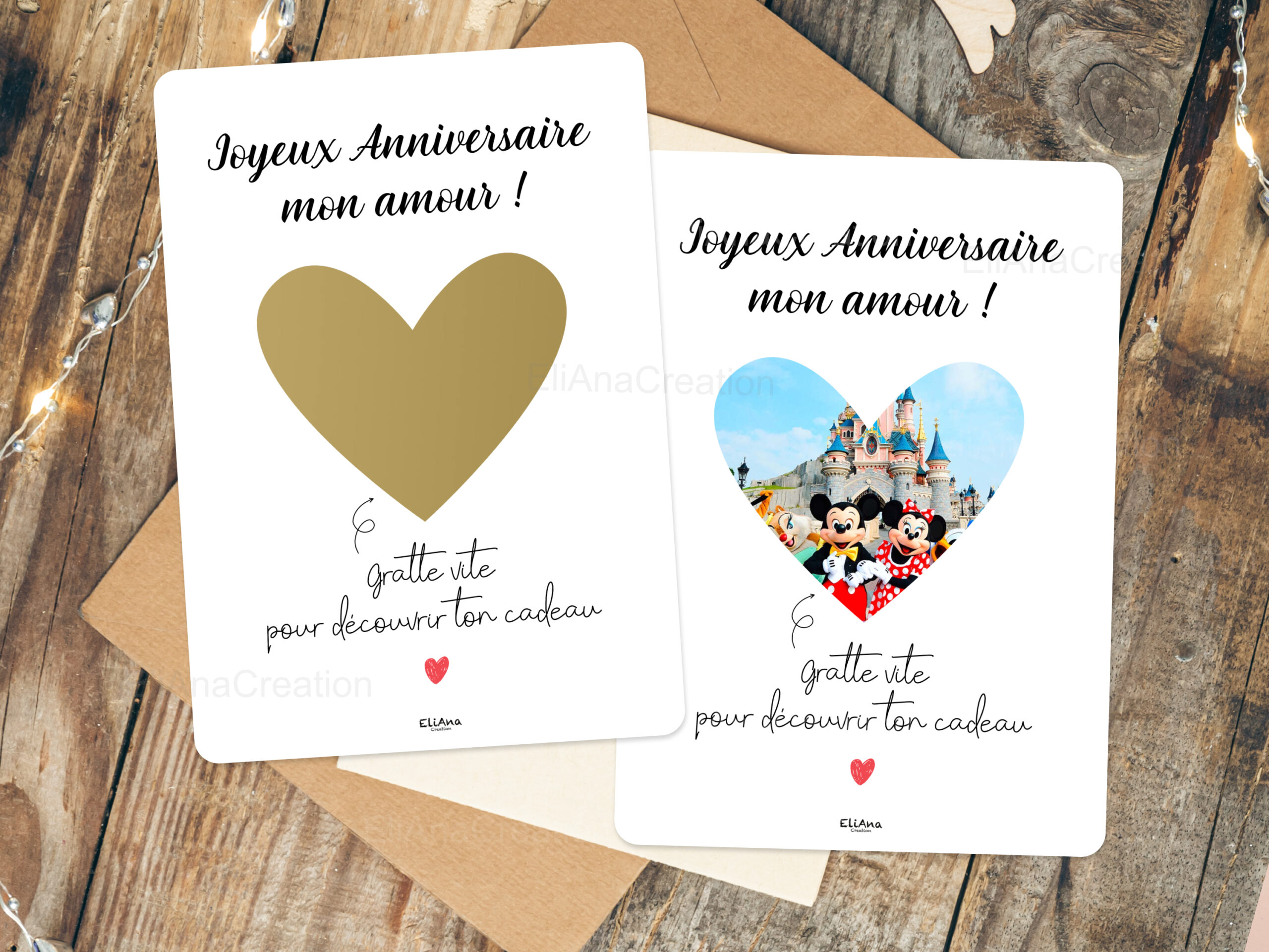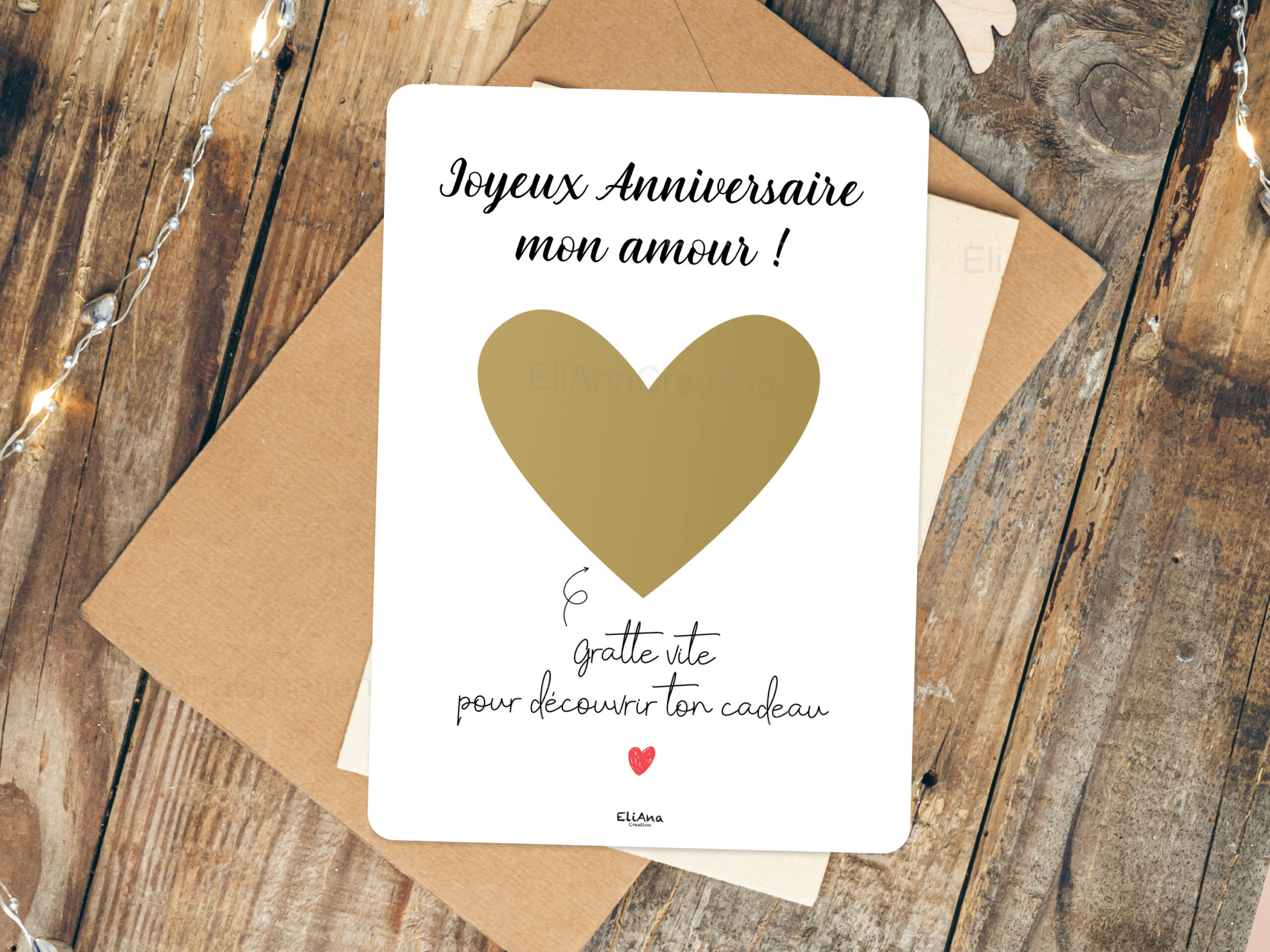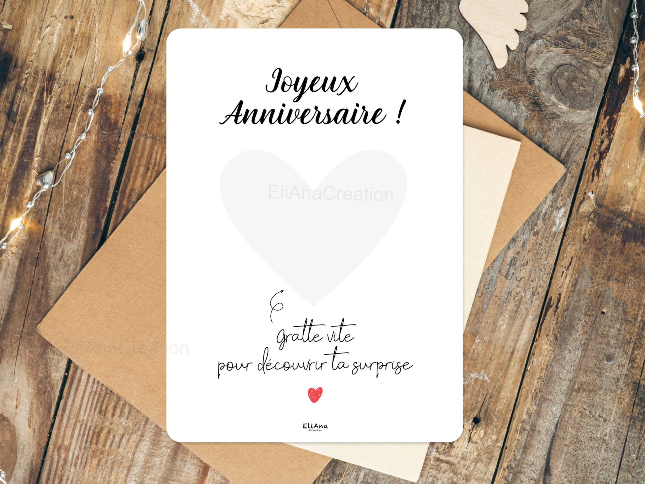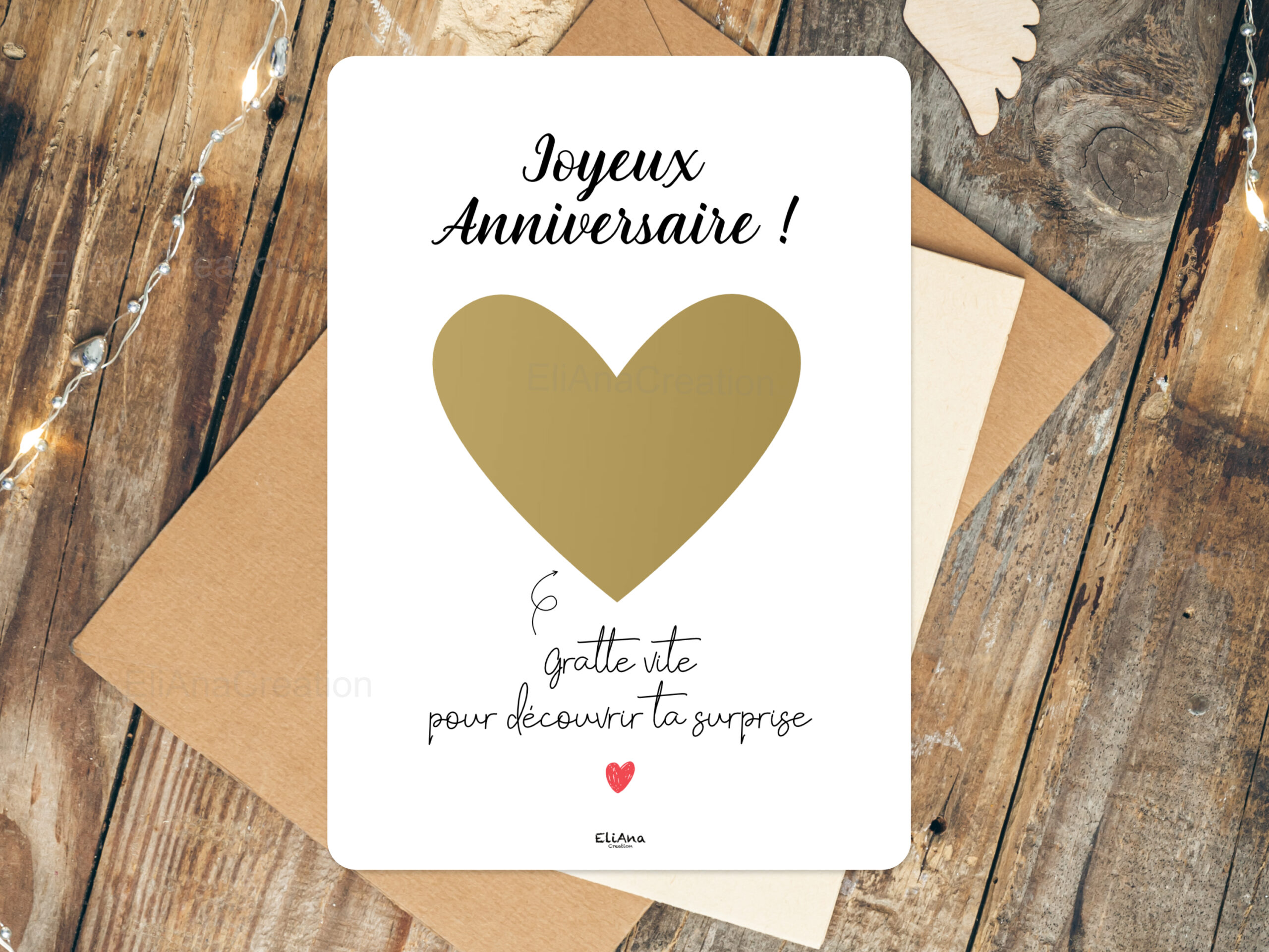 Faites une surprise originale avec cette carte à gratter. Elle est idéale pour annoncer un événement ou tout simplement offrir un cadeau de façon originale. Il suffit de gratter le coeur pour découvrir le message caché !