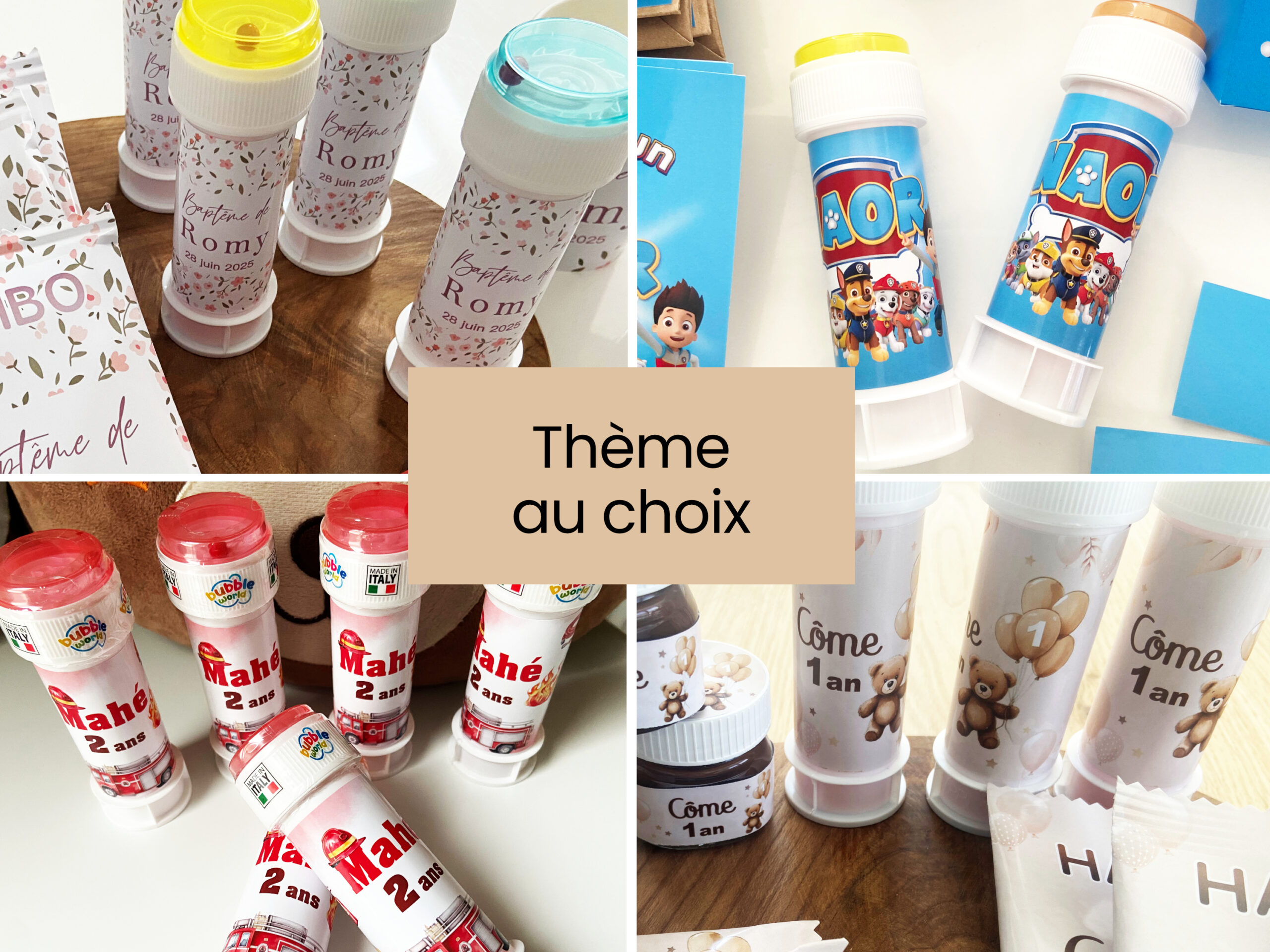 Chaque tube à bulles est personnalisé selon votre thème pour s’intégrer parfaitement à votre décoration et offrir un joli détail à la fois ludique, élégant et mémorable.