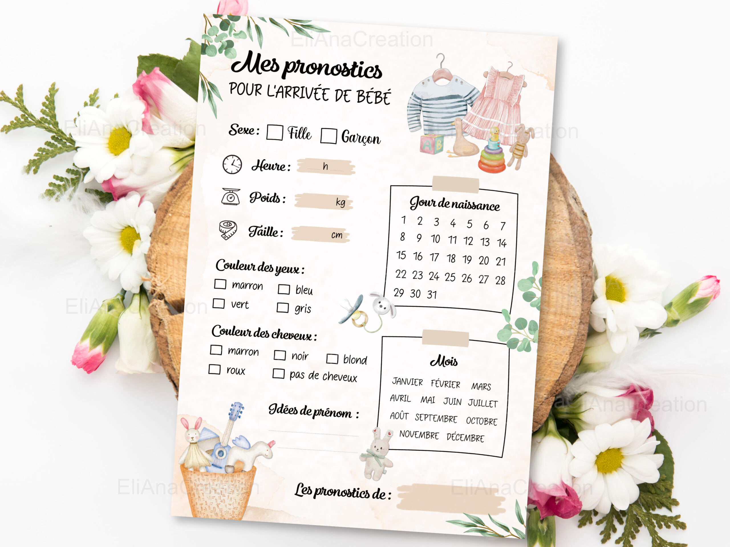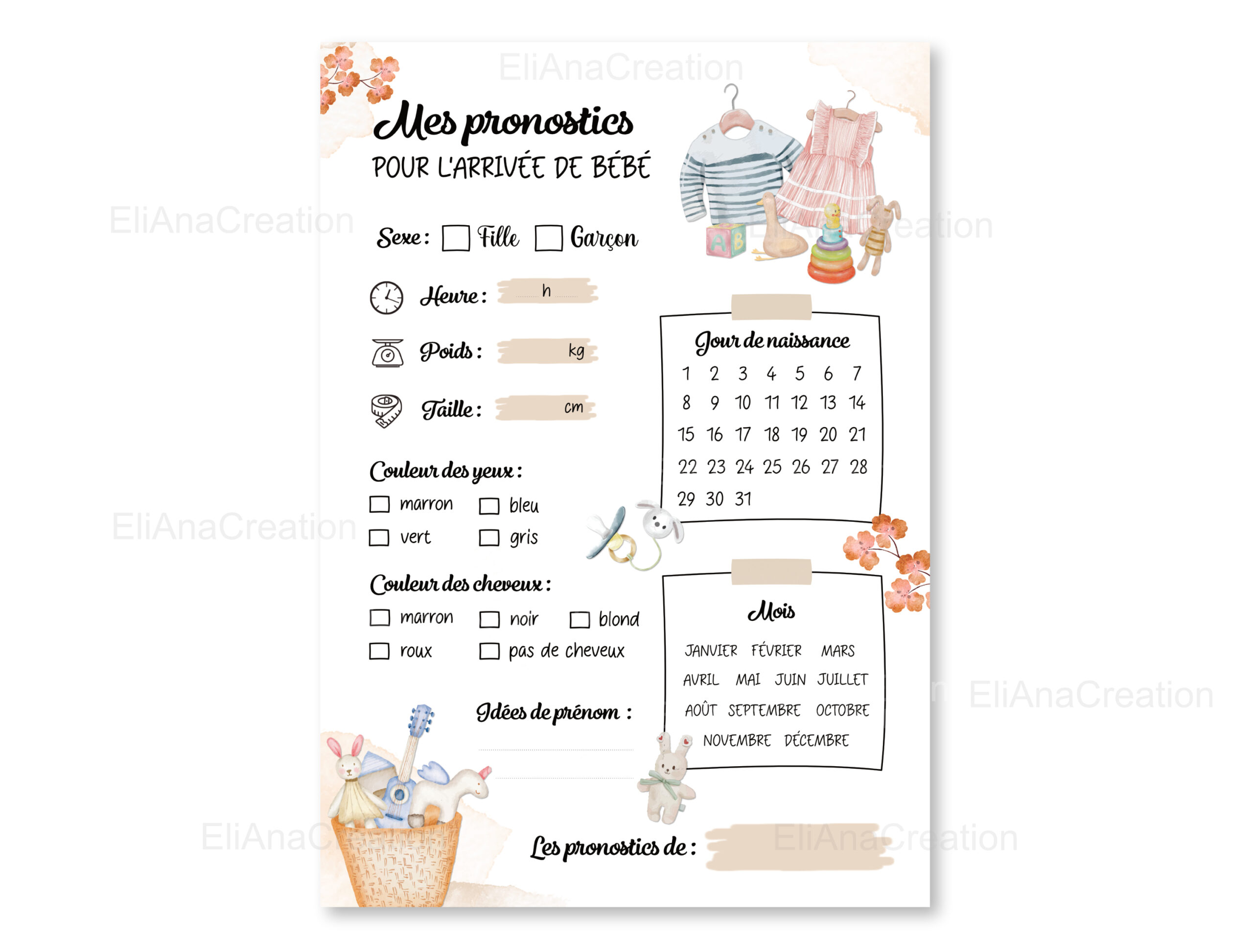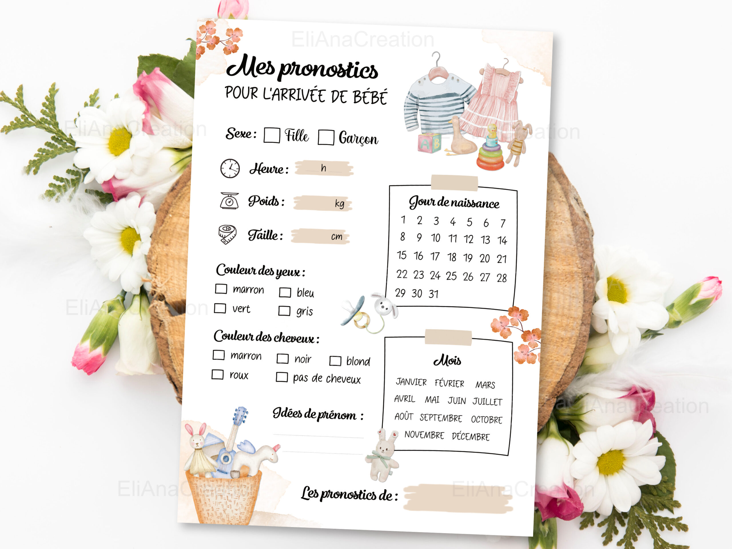 Cette carte pronostics invite vos proches à se prêter au jeu des pronostics en essayant de deviner les petits détails du futur bébé : date de naissance, heure, poids, taille, ou encore couleur des yeux et des cheveux.