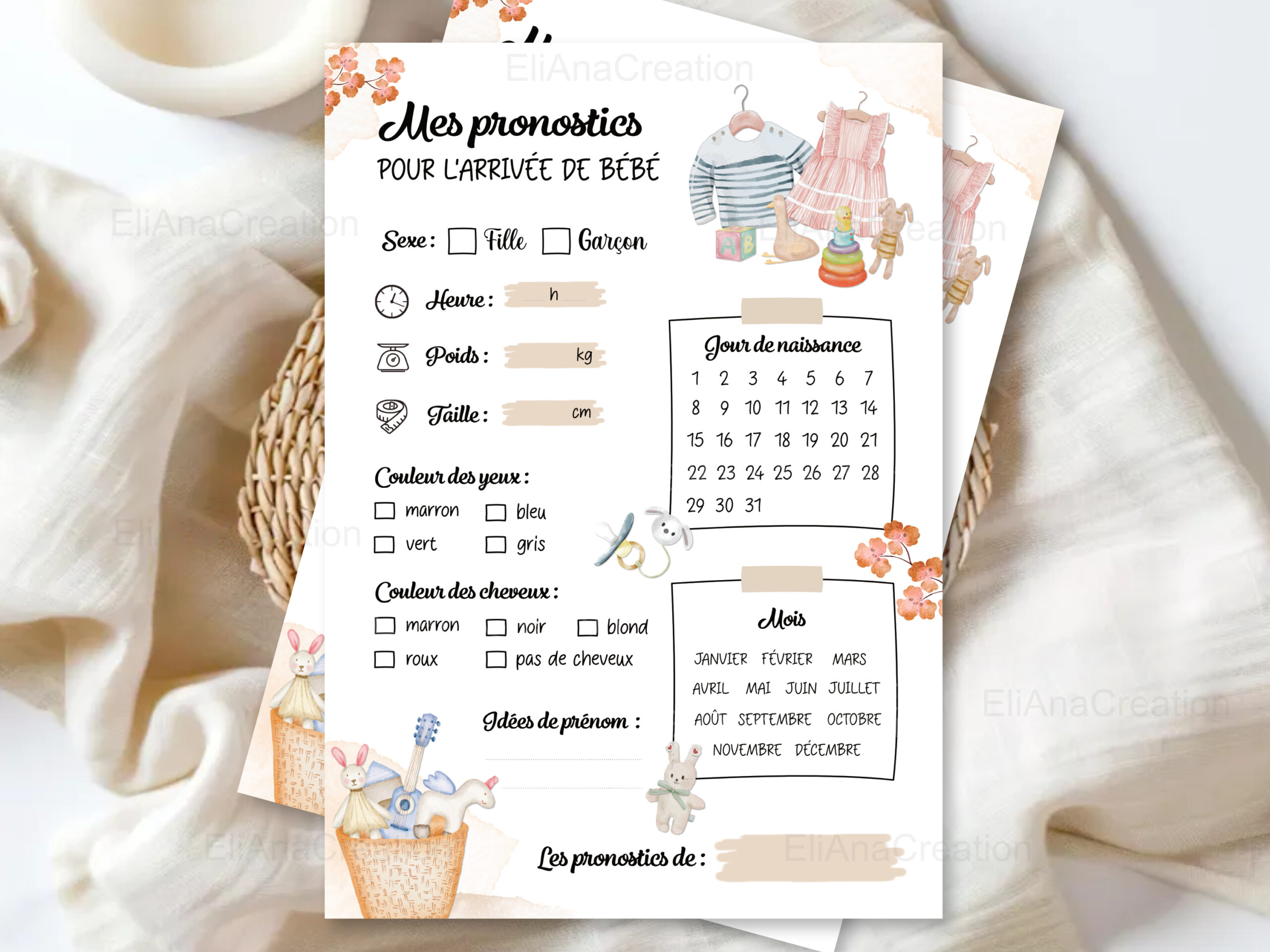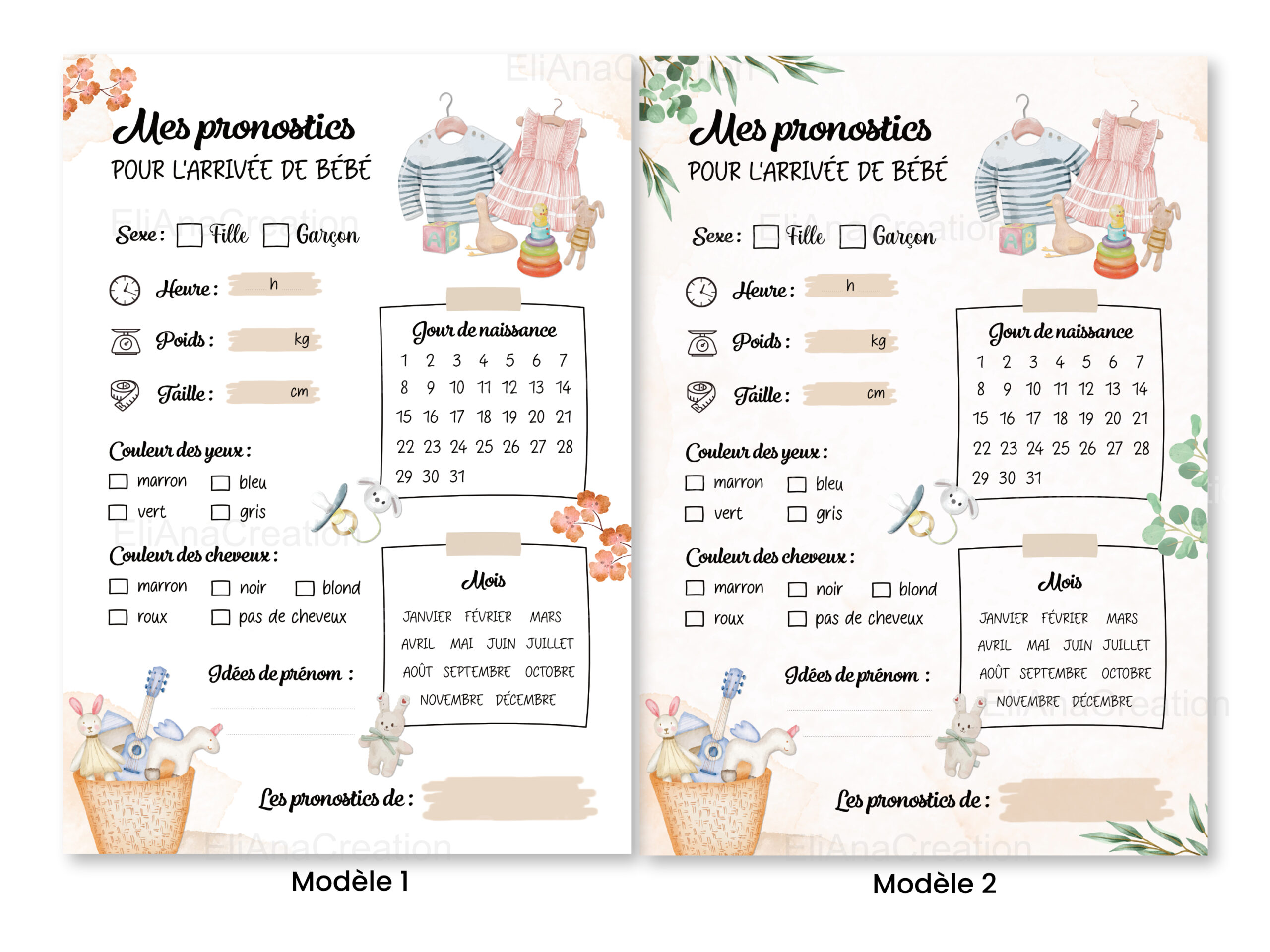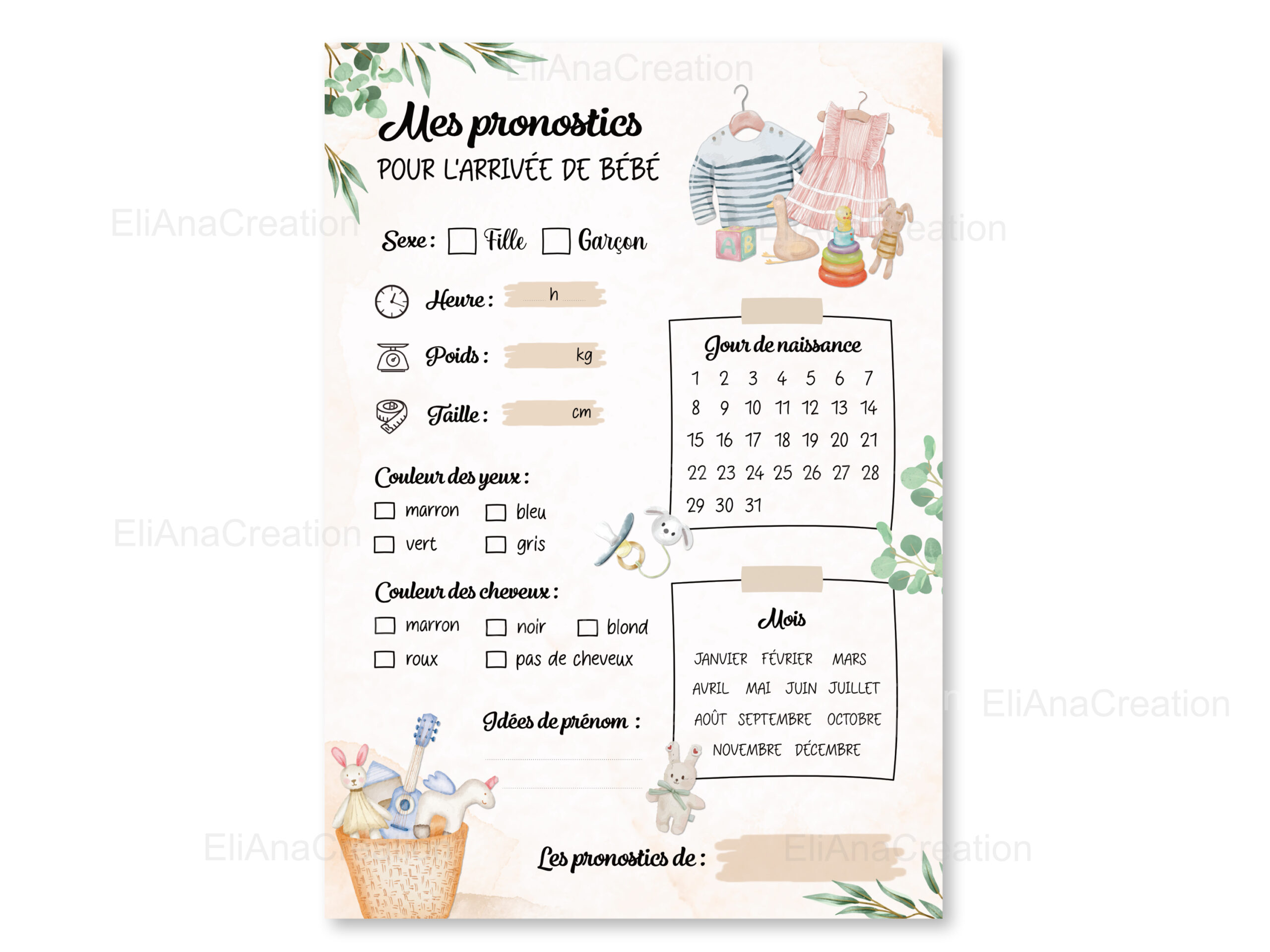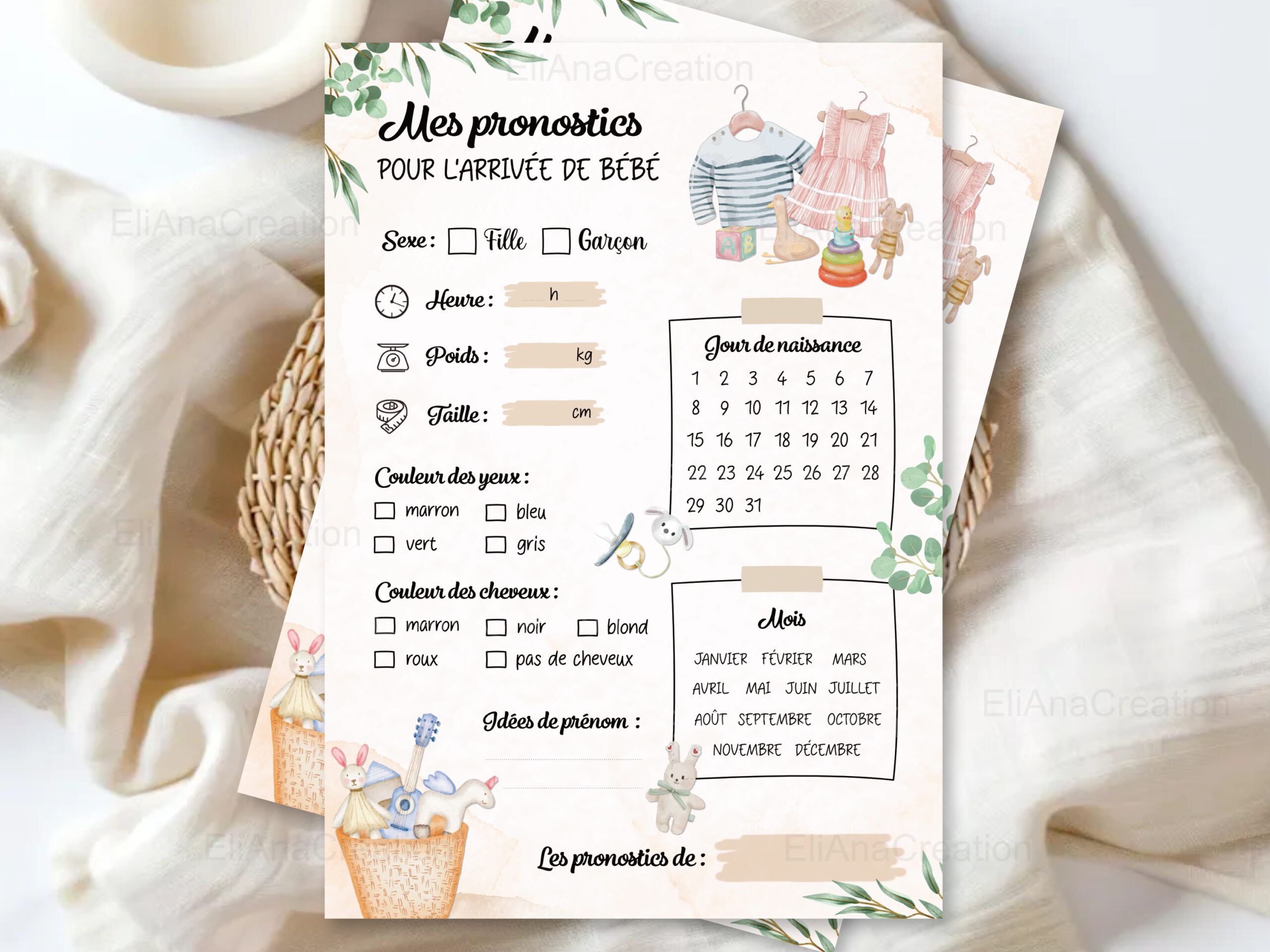 Cette carte pronostics invite vos proches à se prêter au jeu des pronostics en essayant de deviner les petits détails du futur bébé : date de naissance, heure, poids, taille, ou encore couleur des yeux et des cheveux.